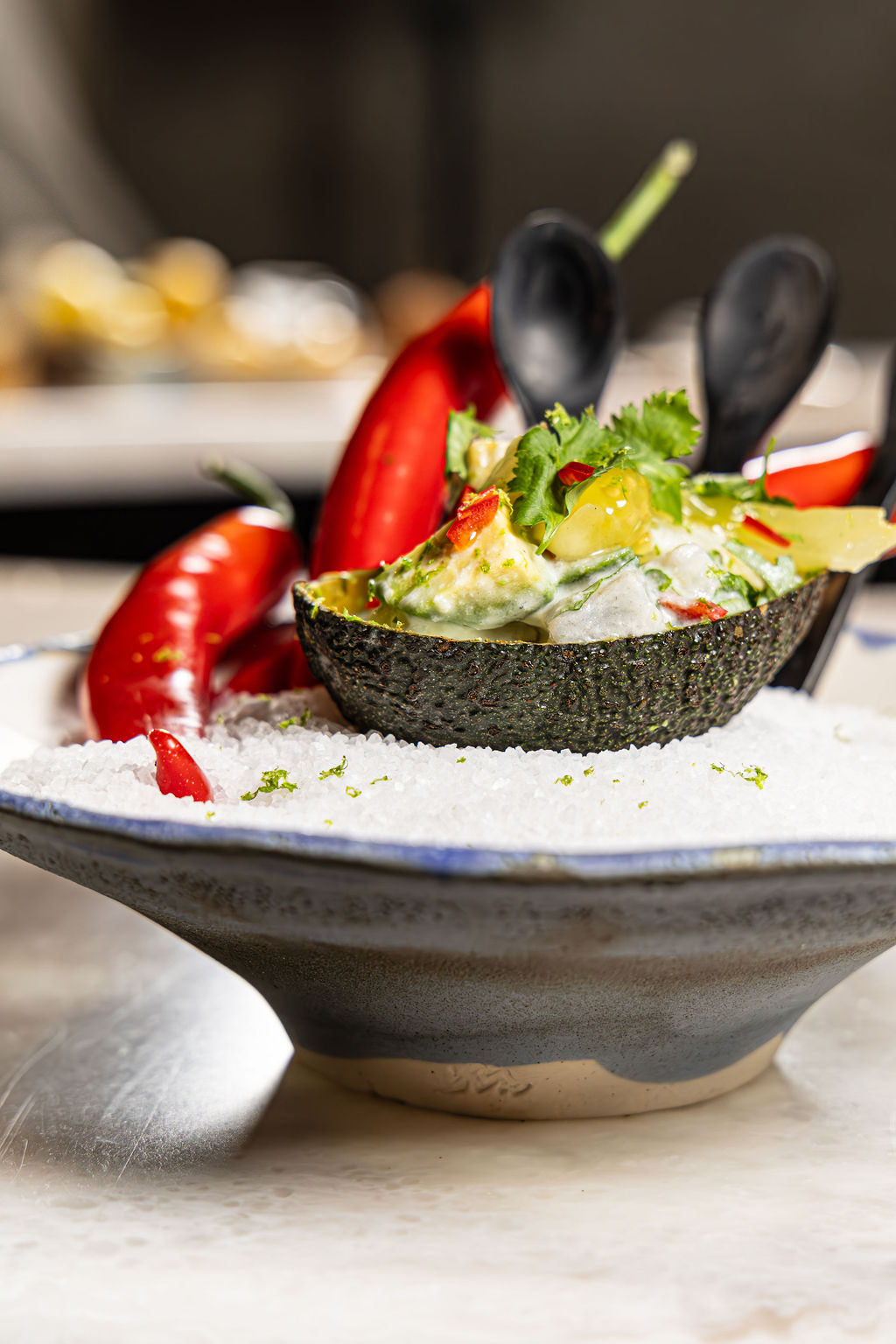 - Schep het ceviche-mengsel in de gereserveerde avocadoschil.